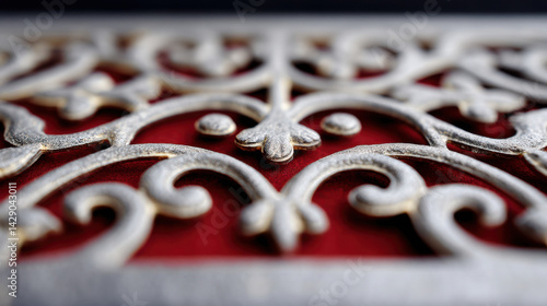 Intricate filigree design with metallic accents on red background, showcasing craftsmanship and elegance