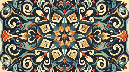 Intricate floral pattern with vibrant colors on a dark background, creating a symmetrical design.