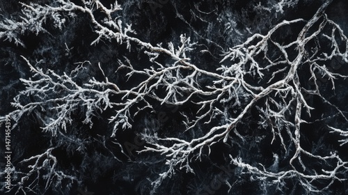 Intricate frost-covered branches on a dark background.