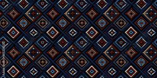 Intricate geometric seamless pattern with blue and red symmetrical diamond design