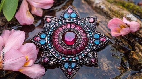 Intricate jewelry design featuring gemstone brooch amidst blooming flowers