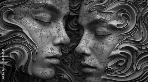 Intricate Sculptural Faces Merging in Detailed Grayscale Art romantic minimalistic background