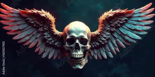 Intricate skull adorned with large, feathered angel wings , hell, life, bone