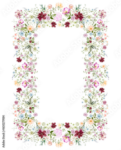 Intricate watercolor frame with small jasmine, roses, and peonies. Rectangular floral border for wedding invitation, greeting card, template, botanical design, and decorative art.