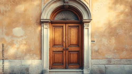 Intricate wooden door on a textured wall in a peaceful neighborhood