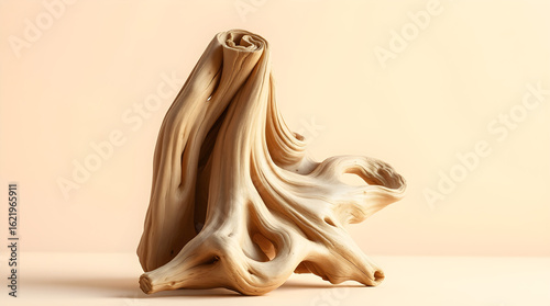 Intricate wooden sculpture standing on a peach colored surface