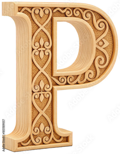 Intricately carved and highly detailed wooden capital letter 'P' with a warm, light brown hue and ornate floral patterns, presented in a slightly angled, isolated on transparent background.