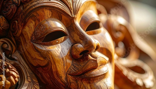 Intricately carved wooden sculpture of spiritual face with polished texture and natural grain for editorial cultural heritage religious art and traditional craftsmanship-themed visuals