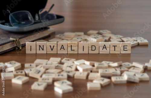 invalidate word or concept represented by wooden letter tiles on a wooden table with glasses and a book