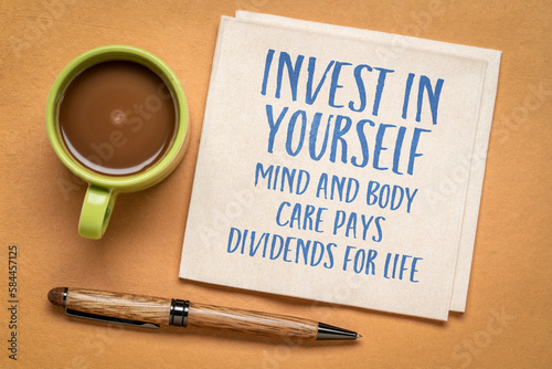 Invest in yourself. Mind and body care pays dividends for life. Inspirational advice or reminder on a napkin, self care concept.