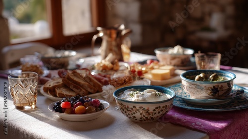 Inviting breakfast table with assortment of regional dishes and fresh ingredients