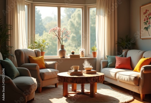 inviting cozy home interior bathed natural light warm accents comfortable furnishings, decor, furniture, lighting, windows, sunlight, room, walls, plants