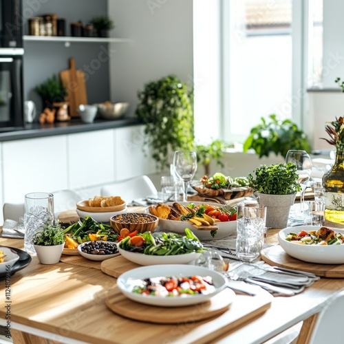 Inviting dining table with fresh salads and bread in sunlit modern kitchen.