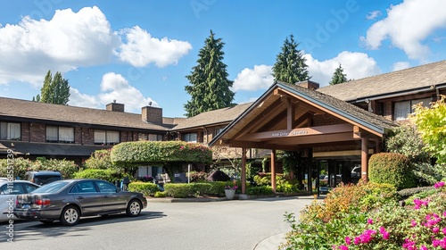 Inviting entrance of a senior care facility with a spacious parking lot and beautifully landscaped garden. Serene and welcoming environment for elderly care.