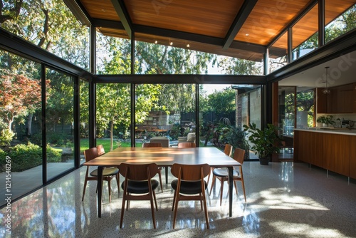 Inviting midcentury modern dining area with elegant table and chairs bright natural light through large windows serene garden view