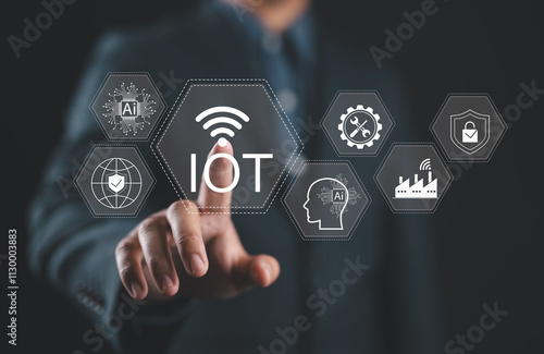 IoT Technology and Wireless Connectivity Concept. Internet of Things, Businessman touching on IoT interface with icons AI, global networking, industrial automation, smart home, cybersecurity solution