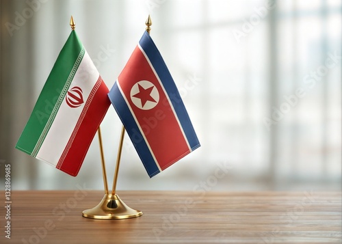 Iranian and North Korean Flags on a Table, Symbolising International Relations
