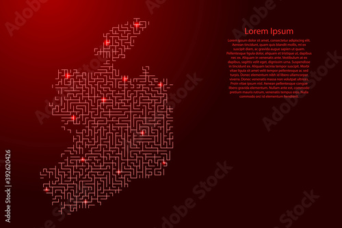 Ireland map from red pattern of the maze grid and glowing space stars grid. Vector illustration.
