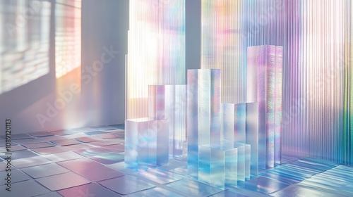 Iridescent 3D graph with tall transparent bars reflecting digital patterns, set against a bright, clean background with soft shadows and light effects.