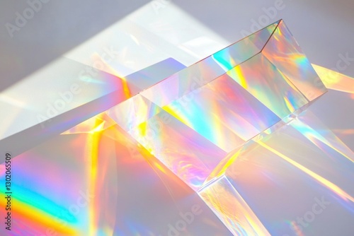 Iridescent glass prism refracting light, creating colorful rainbow patterns.