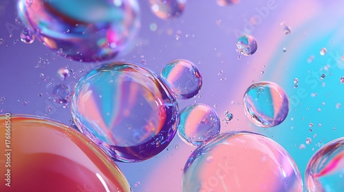 Iridescent liquid bubbles suspended in dreamy pastel gradient, capturing mesmerizing macro fluid dynamics with ethereal color transitions and delicate spherical shapes