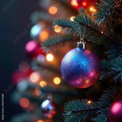 Iridescent ornaments glimmer on the branches of a stunningly decorated Christmas tree under sparkling lights, ornaments, sparkling