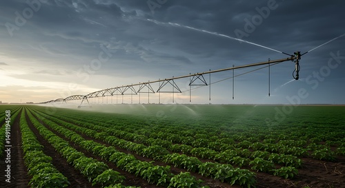 Irrigating Farm Field with Sprinkler System at Sunset