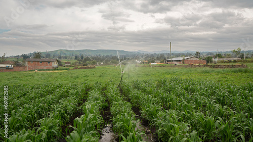 irrigation sprinkler operating in the center of a corn field with houses and trees on a cloudy day