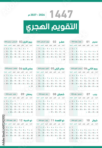 Islamic Hijri 1447. Vector yearly calendar template with the start of the week Saturday in green colors. Translation of (Hijri New Year 1447)