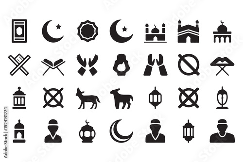Islamic symbols set mosque crescent moon lantern quran people prayer and animals vector icons