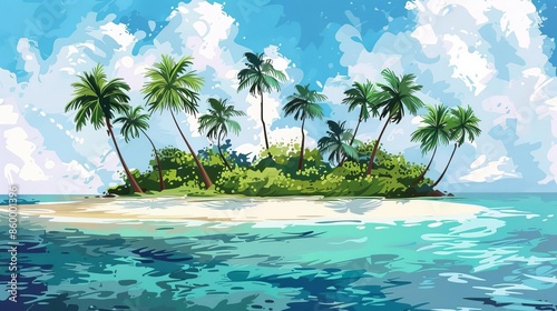 Island Illustrate a tropical island paradise with palm trees, white sand, and clear blue water.