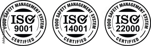 ISO 9001, 14001 and 22000 certified stamp collection - quality management system international standard emblems set - isolated vector sign