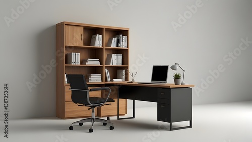 Isolated 3D Visualization of Office Desk, Swivel Chair, Filing Cabinet, and Bookshelf on White Background