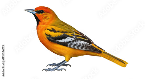 Isolated Baltimore Oriole, a vibrant songbird with yellow and black plumage, stands in sunshine