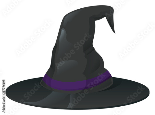 Isolated Black Witch Hat Decorated with Purple Ribbon, Vector Illustration