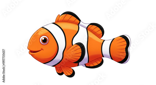 Isolated clownfish swimming, smiling cheerfully, vibrant orange with white stripes, ocean life