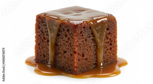 Isolated cube of English sticky toffee pudding with sauce on white background for dessert and food photography