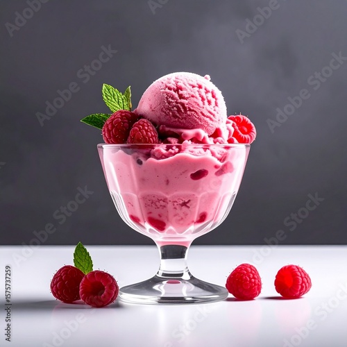 isolated cup of strawberry ice cream on a white table on a grey background, food photography