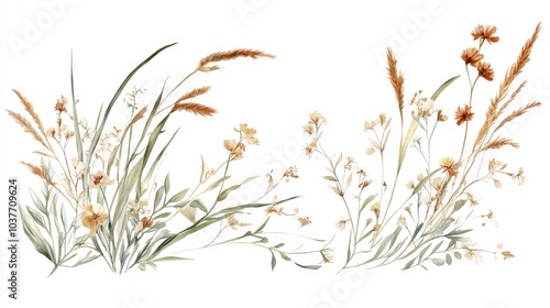 Isolated frame featuring watercolor elements including flowers and blades of grass in a Bohemian style Botanical illustration