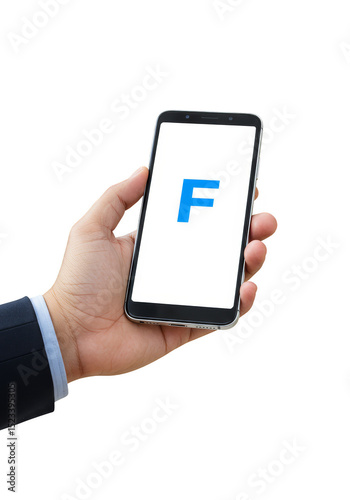 Isolated Hand Holding a Smartphone with Blue Logo on a White Screen