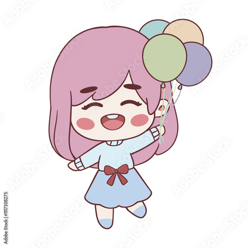 Isolated hand-drawn illustration of a cute girl holding colourful balloons and smiling happily suitable for use as a sticker with the theme of birthday parties, festivals, etc.