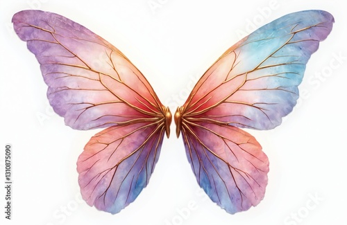 Isolated pair of fantasy fairy wings on transparent background. Blue, purple, rose colors with gold veins. Magical dreamy angelic wings for clip art or decor elements.