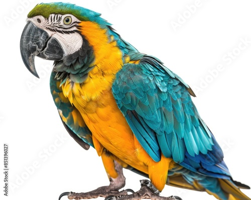 Isolated Parrot. Ara Ararauna, Blue and Yellow Pet Bird in Studio on White Background