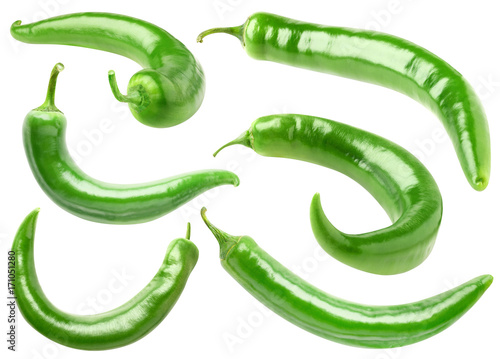 Isolated peppers. Various hot green peppers isolated on white background with clipping path