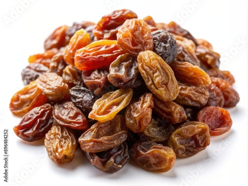 Isolated raisins scattered randomly against a transparent background, showcasing their natural wrinkles and varied brown colors, with soft shadows highlighting their textures.