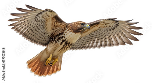 Isolated Red-tailed Hawk soars with wings fully extended, brown and white feather pattern detail