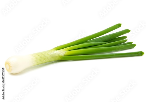 Isolated scallion with white bulb and green stalks lying on a plain white surface in bright light