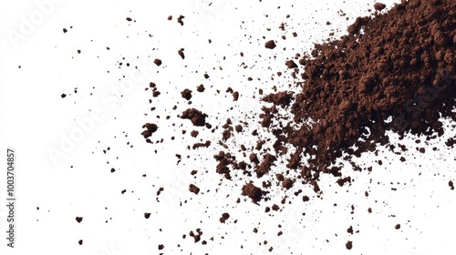 Isolated soil dirt scattering and flying in mid-air, spreading dynamically across a white backdrop.