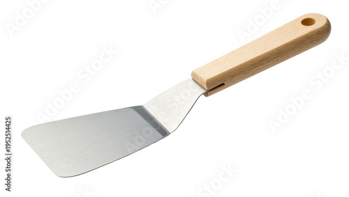 Isolated stainless steel spatula with wooden handle, essential kitchen utensil for cooking and serving.