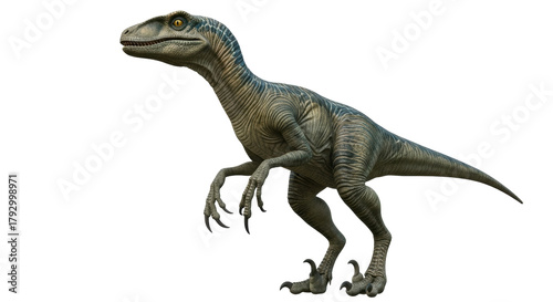 Isolated Velociraptor stands tall with sharp claws, prehistoric predator ready to strike